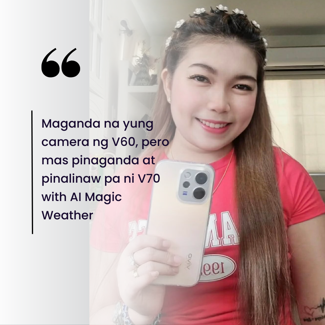 “Maganda na yung camera ng V60, pero mas pinaganda at pinalinaw pa ni V70 with AI Magic Weather. Mahilig kasi ako sa photography… importante sa akin yung camera, performance, battery life, at storage.”